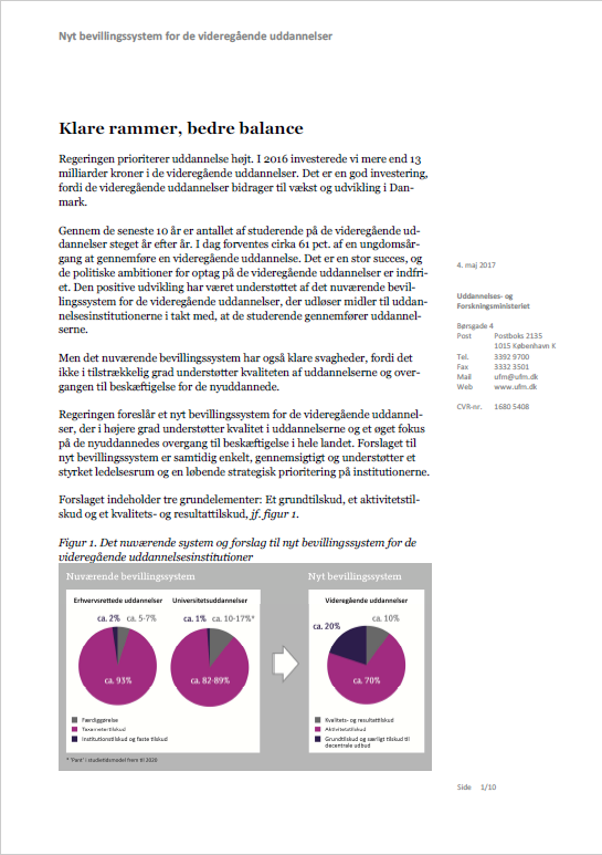 I dag fordeles de fleste af bevillingerne til videregående uddannelse i takt med, at de studerende består eksamener eller gennemfører uddannelsesaktiviteter. Fremover foreslår regeringen, at en markant større del skal fordeles som et grundtilskud og desuden oprettes et nyt kvalitets- og resultattilskud.