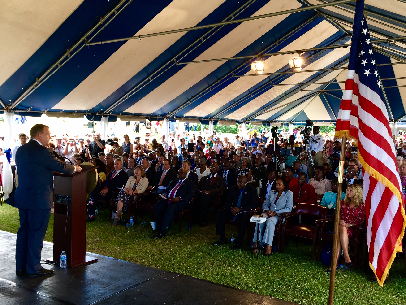 Konow proklamerede på engelsk, at han i kongens navn overdrog øerne til USA, og på dansk kommanderede han ”Hal ned Dannebrog!”. Alle tilhørere tog hatten af i respekt, musikkorpset spillede Kong Christian, æreskompagnierne præsenterede gevær, og kanonsalutter blev affyret. Konow berettede, at ”paa Mængden gjorde Flagets Nedhaling et dybt Indtryk, man hørte ikke en Lyd, og mange Taarer blev fældede”. (Tekst: Rigsarkivet)