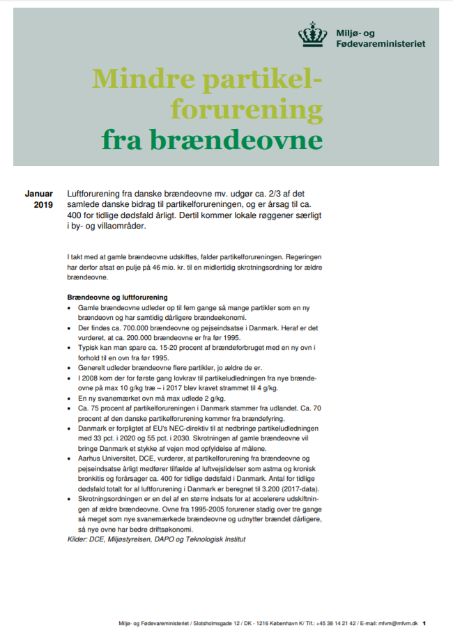 Danmarks ca. 700.000 brændeovne spreder hygge, men også luftforurening. Brænderøgen kan være en gene for naboer, men kan også øge risikoen for alvorlige sygdomme, og ifølge DCE er der hvert år ca. 400 for tidlige dødsfald i Danmark som følge af partikelforurening fra brændeovne. Derfor lancerer miljø- og fødevareminister Jakob Ellemann-Jensen nu en skrotpræmie på 2.000 kroner for at vinke farvel til de mest osende brændeovne fra før 1995.