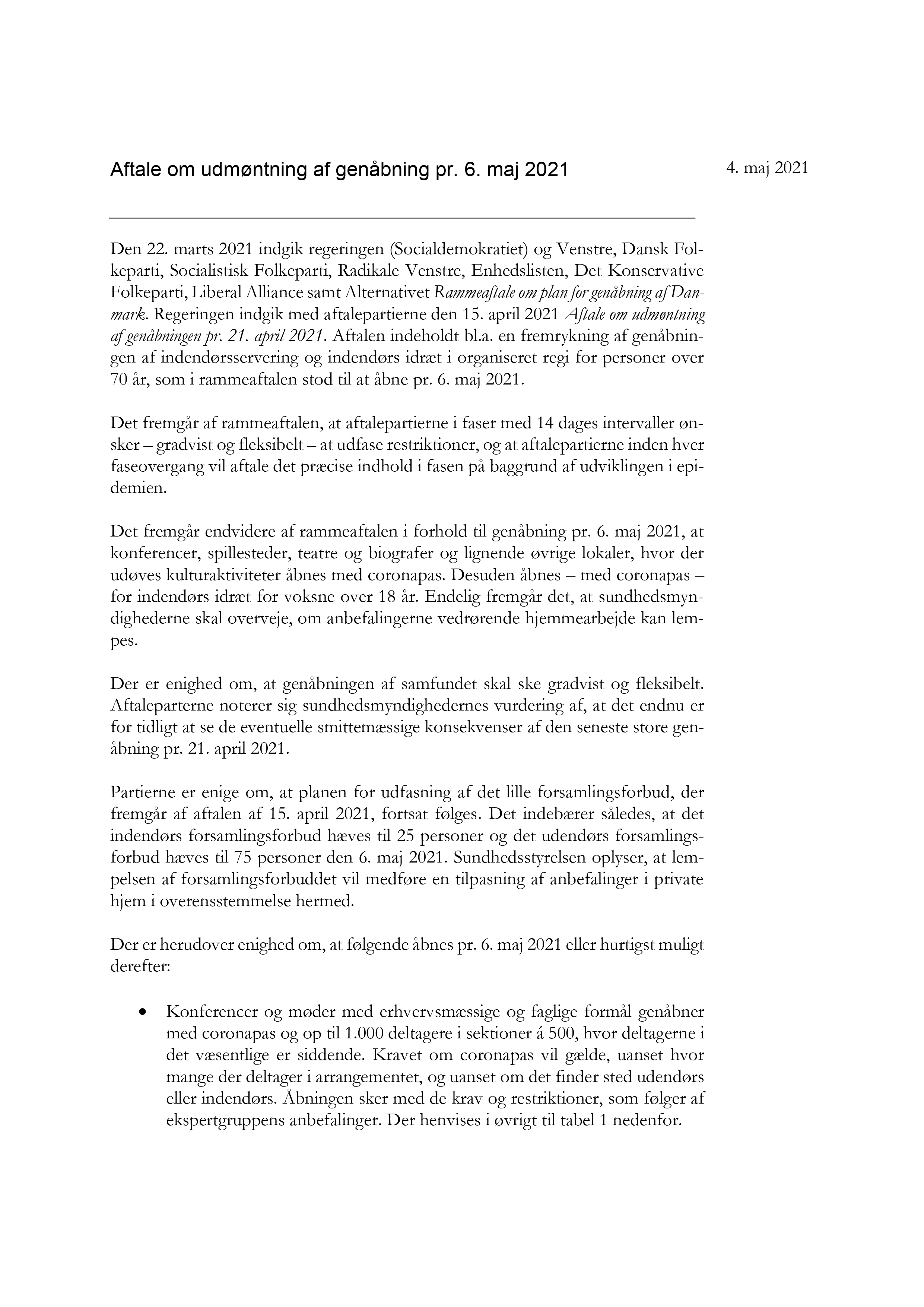 Aftalen om yderligere genåbning kommer som opfølgning på Rammeaftale om plan for genåbning af Danmark af 22. marts 2021. Den nye aftale udmønter den allerede aftalte genåbning pr. 6. maj 2021 af konferencer, spillesteder, teatre, og biografer og lignende øvrige lokaler, hvor der udøves kulturaktiviteter, samt af indendørs idræt for personer over 18 år.