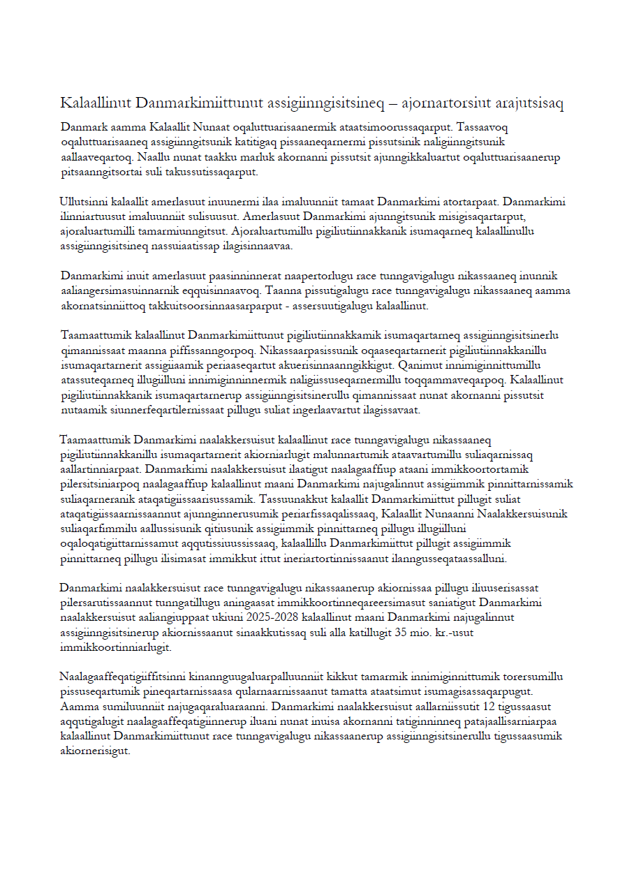Kalaallinut Danmarkimiittunut assigiinngisitsineq aamma race tunngavigalugu nikassaaneq ajornartorsiutaapput ilungersunartut. Taamaattumik Danmarkimi naalakkersuisut ukiunut sisamanut immikkoorteriikkat 35 mio. kr.-nik ilavaat ilutigalugulu kalaallinut Danmarkimiittunut race tunngavigalugu nikassaanerup aamma assigiinngisitsinerup akiornissaanut aallarniissutit tigussaasut 12 saqqummiullugit.