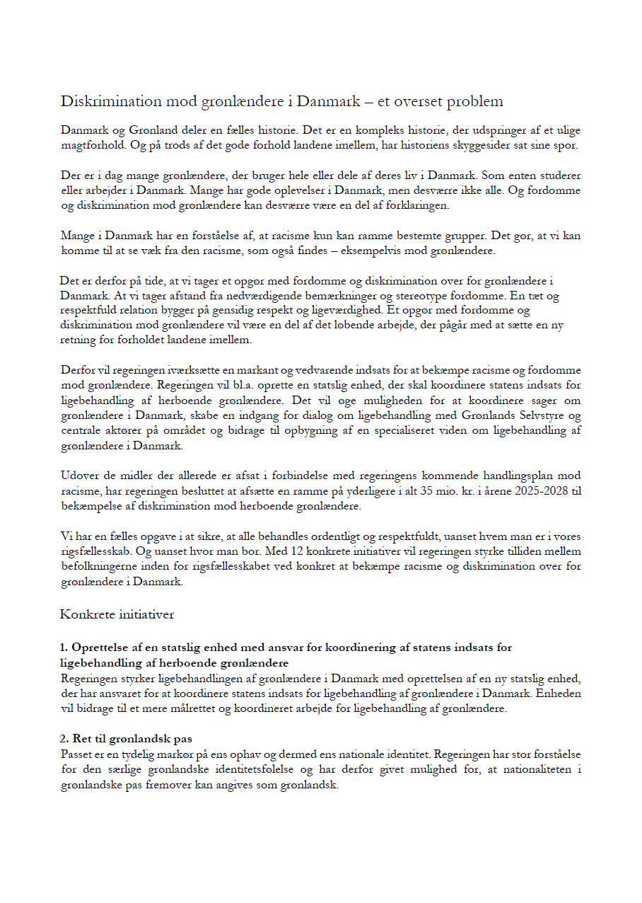 Diskrimination og racisme mod grønlændere i Danmark er et alvorligt problem. Regeringen afsætter derfor ekstra 35 mio. kr. over fire år og fremlægger samtidig 12 konkrete initiativer til bekæmpelse af racisme og diskrimination mod grønlændere i Danmark.